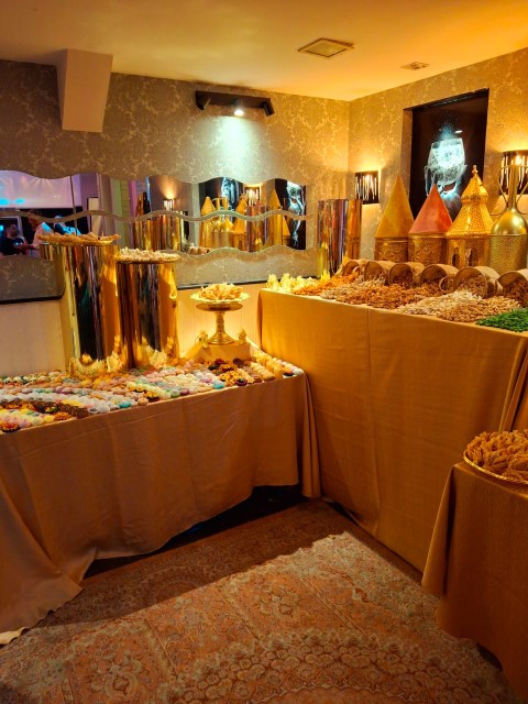עיצוב שולחן המתוקים עם בדים וכלים ושטיחים בכניסה לאולם במתנה